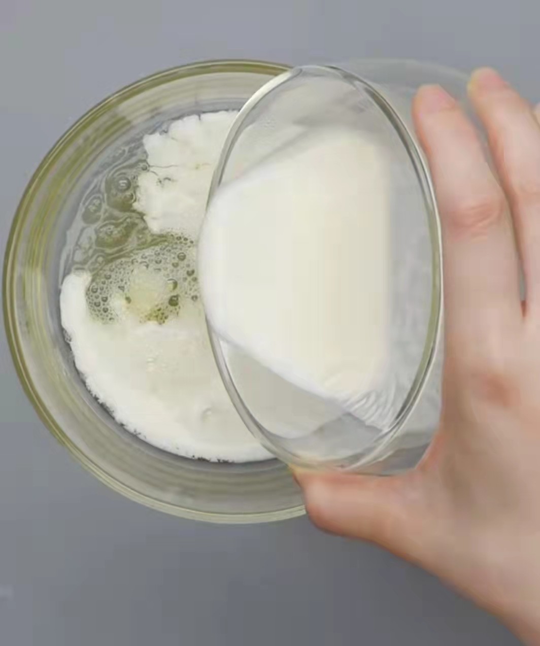 热好的牛奶倒入蛋清,留奶皮和少量牛奶在原来的碗中