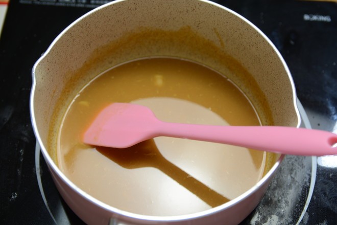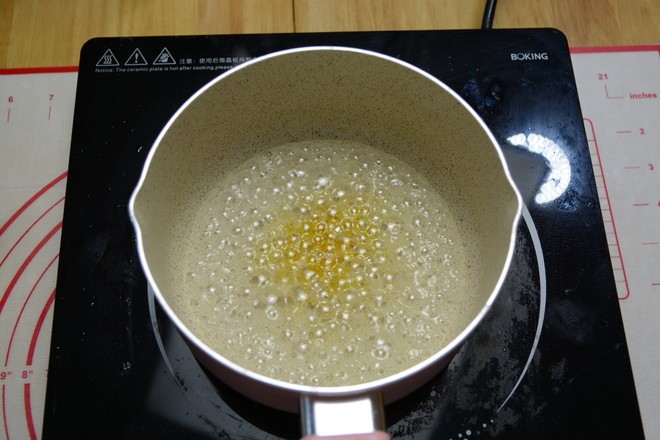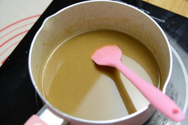 然后开始煮焦糖酱。先将细砂糖和水小火熬煮,不要搅拌,防止返砂。