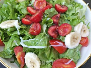适量小番茄,香蕉片,大樱桃去核,挤适量沙拉酱,即可食用。