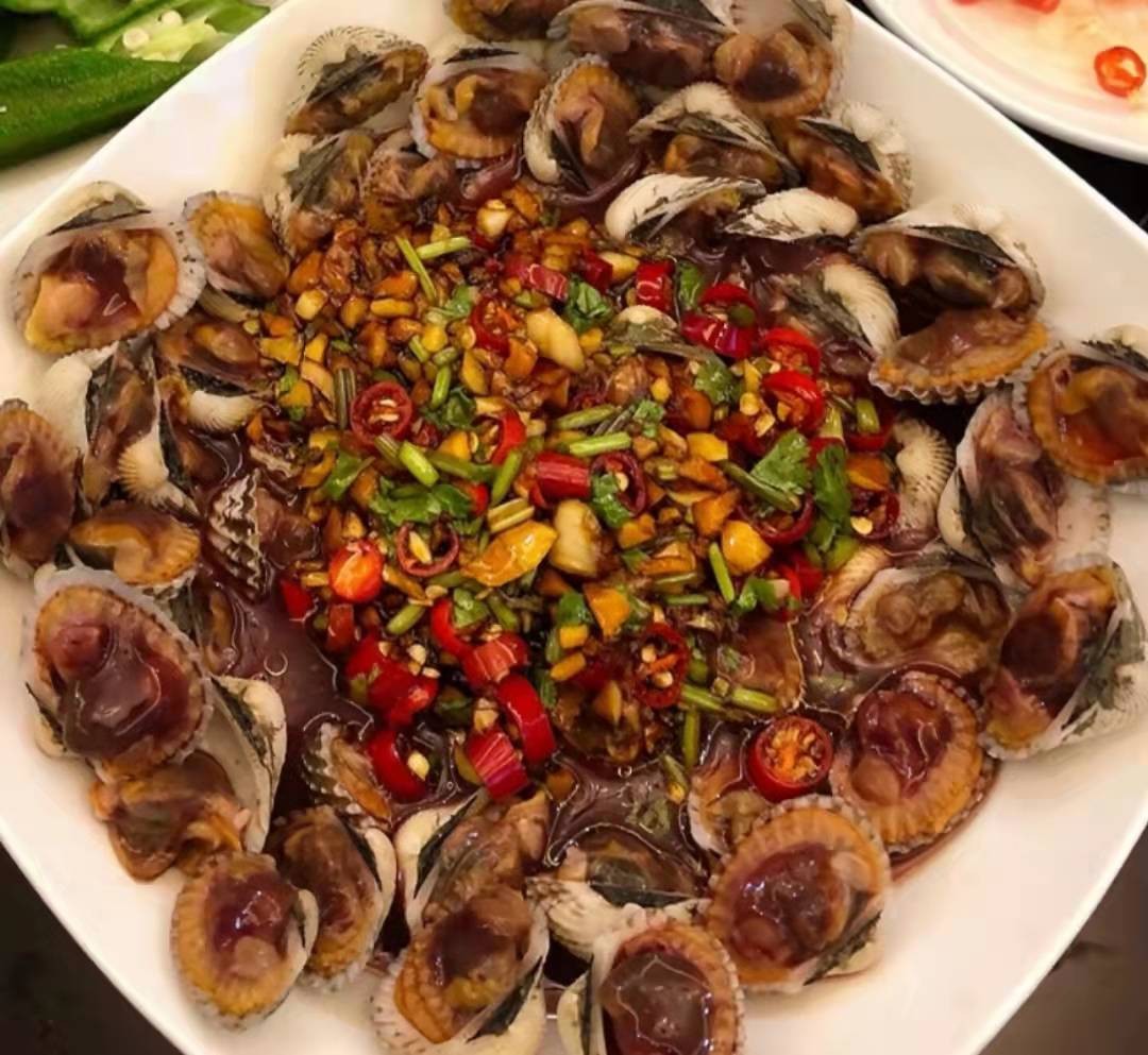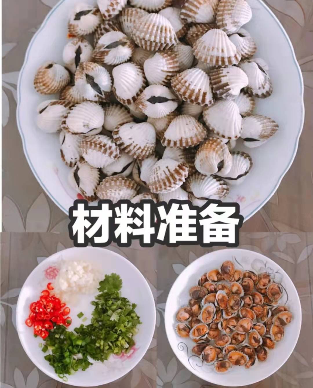 将500克血蛤 冲洗干净,最好拿牙刷或者大刷子在洗篮上刷。烧开一锅水关火,把洗好血蛤放在热水里,用10秒时间,马上用漏勺捞干净水,放凉,然后把血蛤拨开,把有肉那一边用碟子摆满。