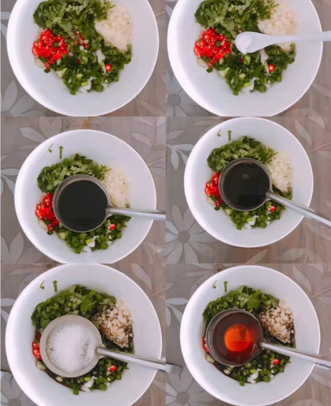用一个碗调制酱汁:蒜末、小辣椒、香菜、葱花适量、1勺盐、2勺酱油、2勺陈醋、1勺香油、白糖小半勺就好