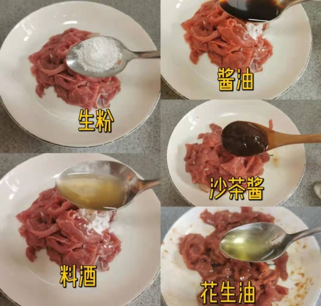 牛肉切薄片 加入料酒,一点点酱油(不要加多)、一勺沙茶酱、一勺生粉搅拌均匀再加入少许花生油抓拌均匀备用。