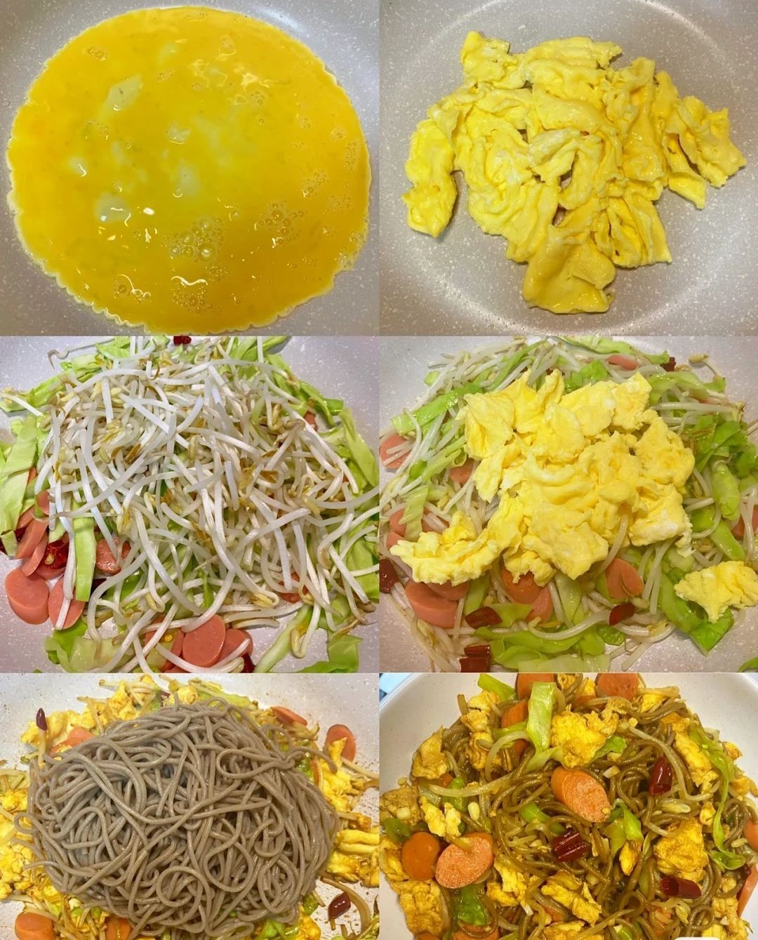 荞麦面煮熟捞出过凉水,鸡蛋炒7分熟捞出备用,锅内倒入油,油热放干辣椒,包菜,豆芽,火腿翻炒至变软,加1勺生抽,1勺老抽,再放入鸡蛋,荞麦面翻炒,出锅前放一勺醋,蒜末,翻炒均匀即可。