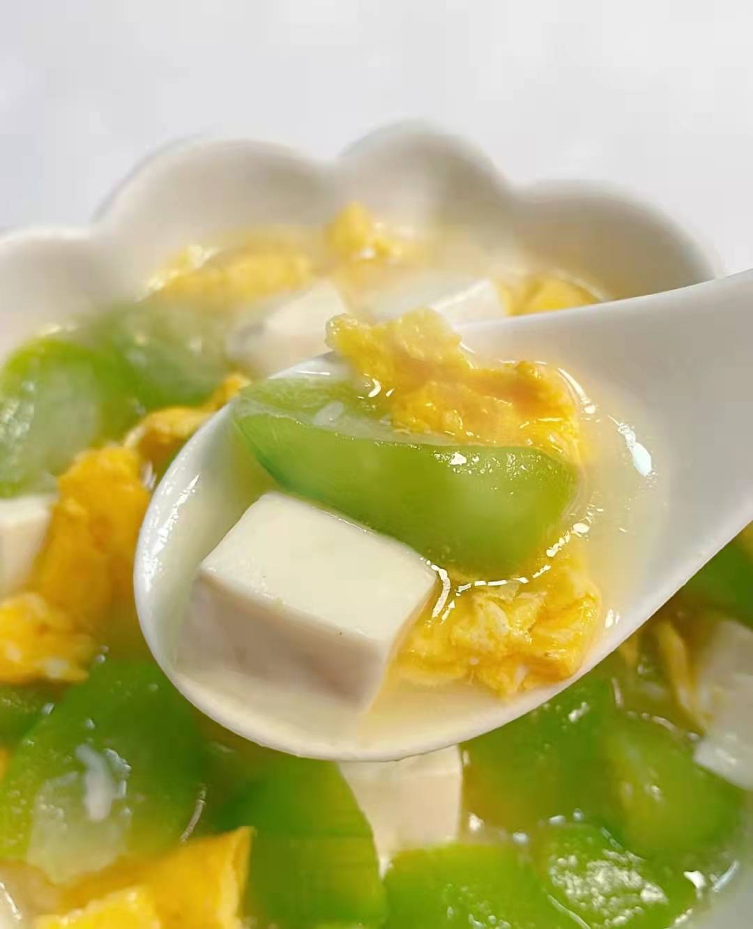 鸡蛋炒7分熟捞出备用,丝瓜去皮切成块,放入锅中翻炒几下倒入热水,丝瓜煮熟后再放入鸡蛋和豆腐,加少许盐和白胡椒粉,煮2分钟即可。