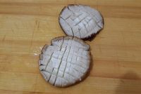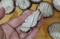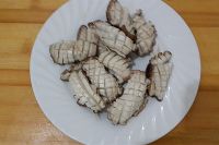 焯过水的香菇控干水份,在香菇背面切成花刀。
