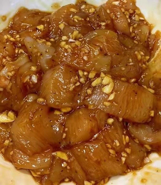 将鸡胸肉切成丁,加1勺料酒,2勺生抽,2勺耗油,蒜末腌制10分钟