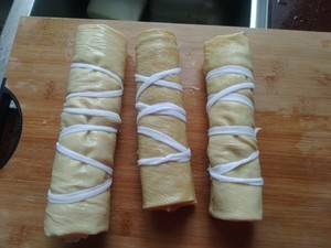 将豆皮卷起来,或者像叠被子一样叠成方块。用棉绳捆绑结实。