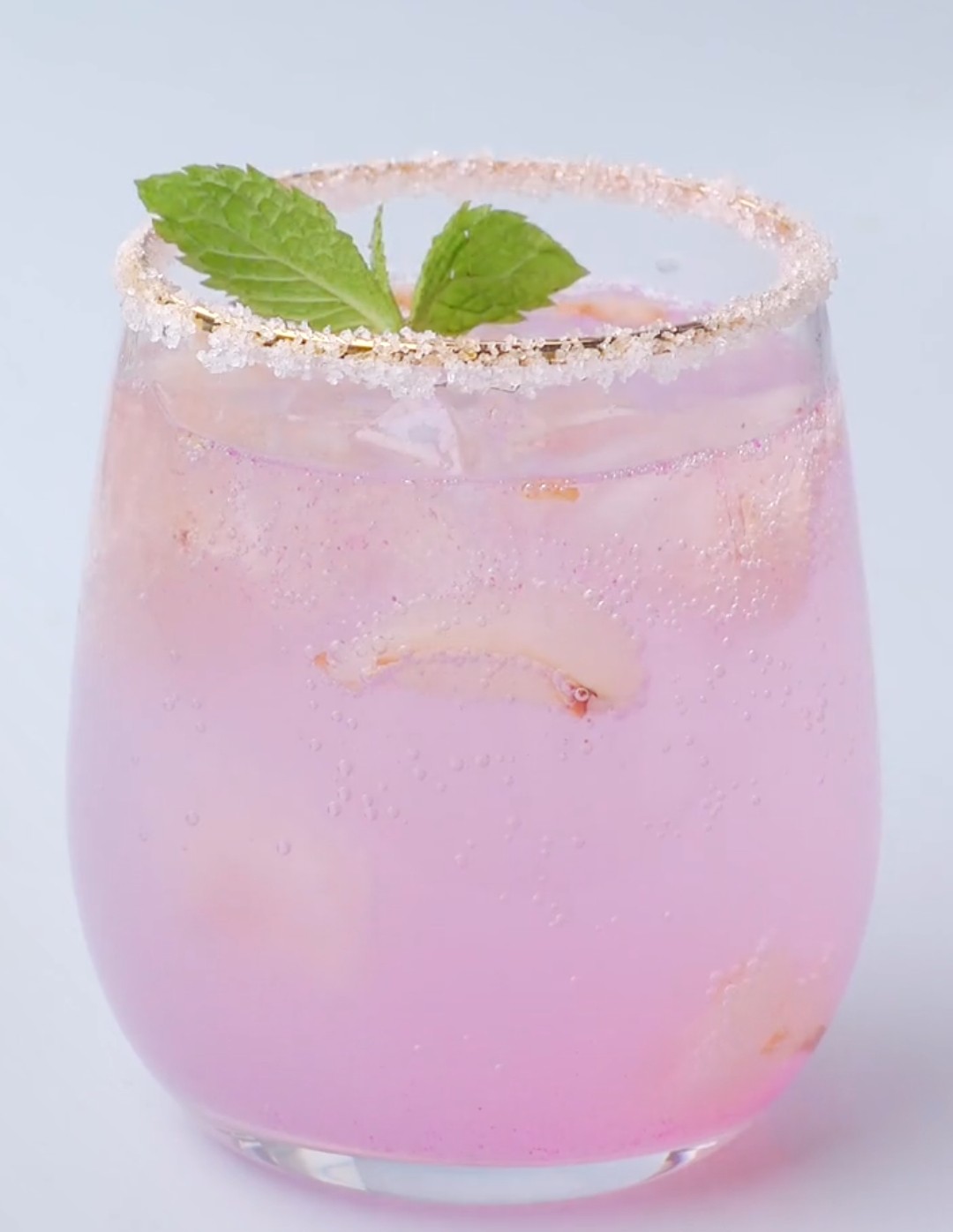 杯口沾一点点糖浆,再粘细砂糖装饰。放入冰块,加荔枝糖浆和糖渍果肉,倒气泡水。
