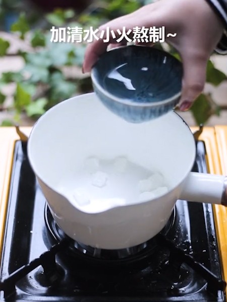 奶锅中倒入冰糖,再倒入清水,小火熬制。