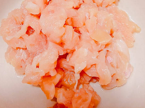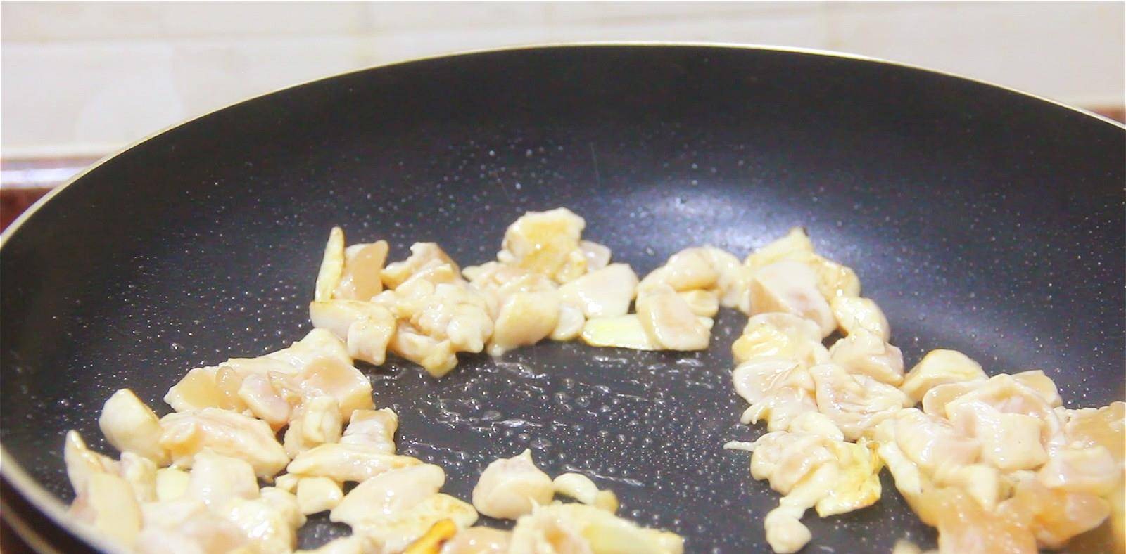 锅中加入少量的油,将腌制好的鸡胸肉倒入并炒熟。