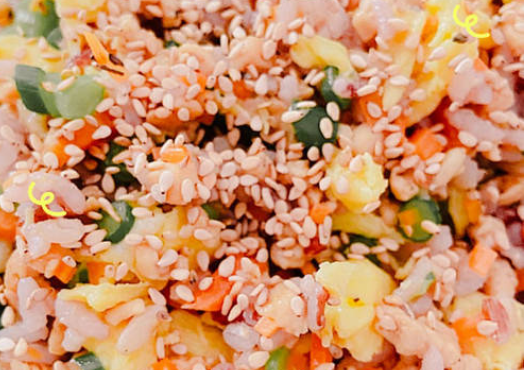 最后把煮好的杂粮米与食材一起搅拌,表面撒上一层白芝麻。