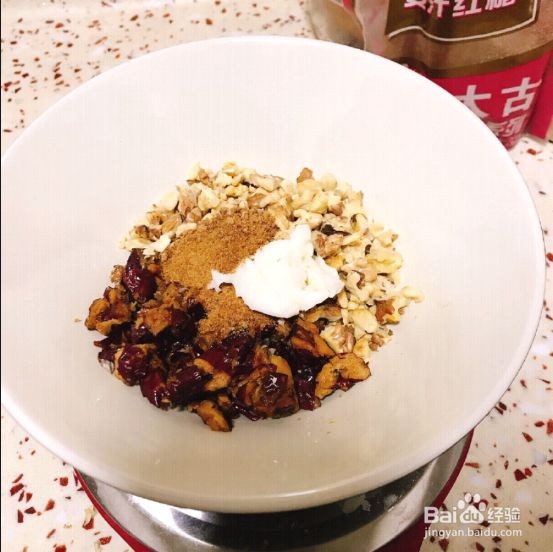 把红枣和核桃混合,加入红糖和猪油拌匀