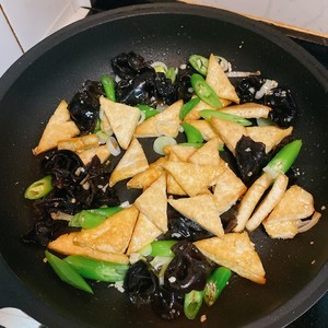 将木耳和杭椒放入锅中一起翻炒