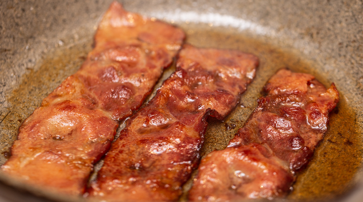 将鸡胸肉焯水煮熟,再放入培根油中煎至表面金黄,撒上黑胡椒,切片盛出