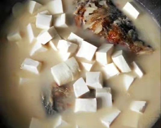 倒入开水,大火烧开,将鱼汤熬至奶白色后下入豆腐炖煮调味