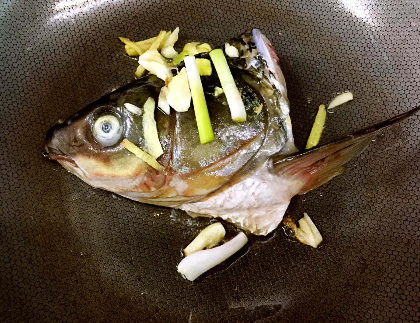将鱼头洗净腌制,下入葱姜蒜将鱼头表面煎至金黄