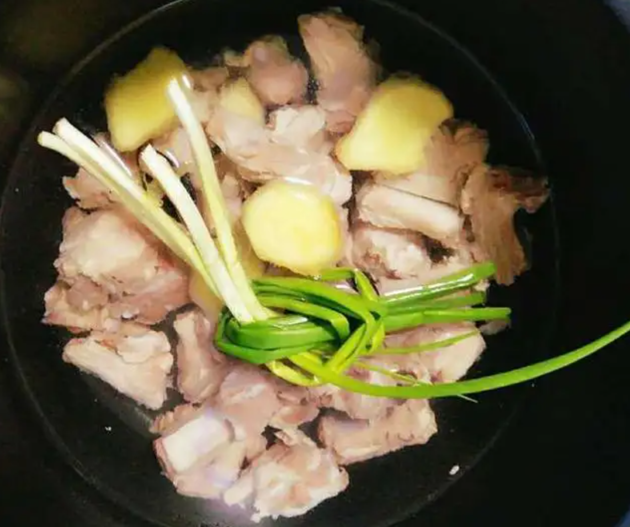 排骨冷水下锅,放入葱姜焯水煮熟,撇去浮沫后盛出备用