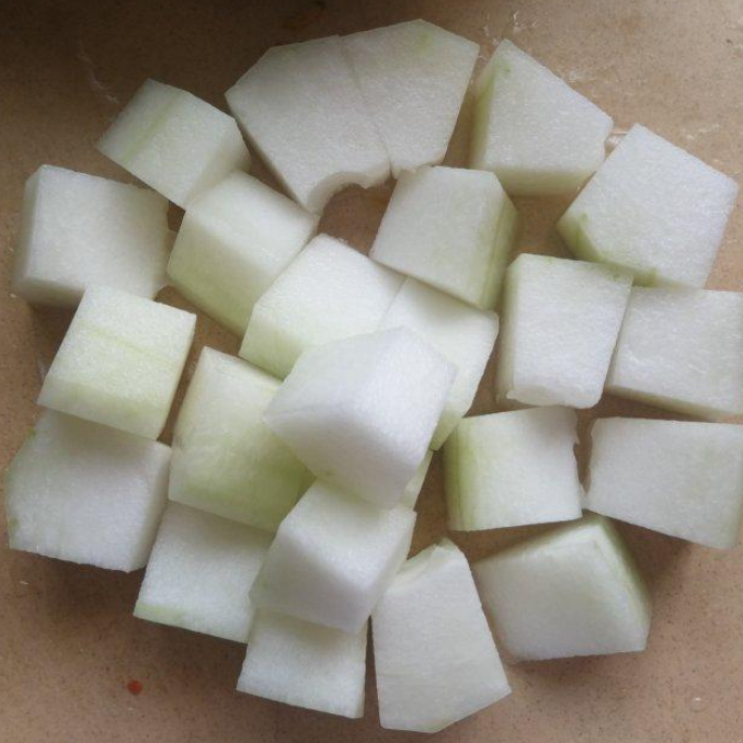 将冬瓜去皮去籽切成小块,在排骨加水大火煮沸一段时间后,下入冬瓜小火炖煮