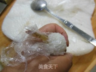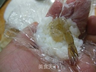 取一个虾仁包入米饭。团成球状,取下保鲜膜。