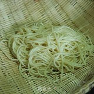 拉面捞出后过冷水沥干,拌上蒜油放入碗中备用。