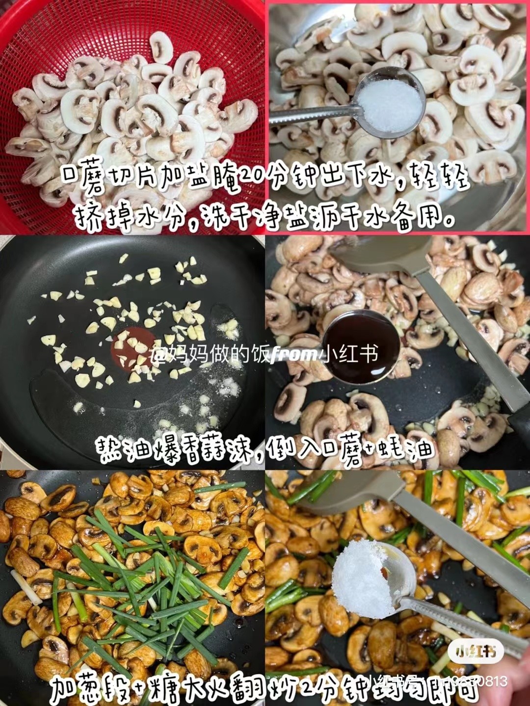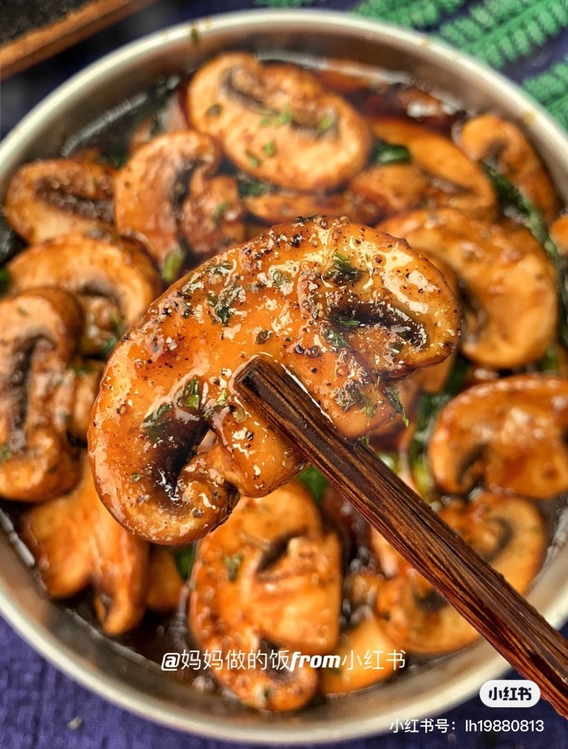食材:调料4CM圆勺 20个口蘑,5个蒜瓣。半勺盐,半勺糖,1勺蚝油,1把葱,黑胡椒碎,欧芹碎 做法: ①20个口蘑切片,加半勺盐腌20分钟出下水,轻轻挤掉水分,洗干净盐沥干水备用。 热油爆香5个蒜沫,倒入口蘑+1勺蚝油+1把葱段+半勺糖大火翻炒2分钟,撒点黑胡椒碎+欧芹碎出锅。