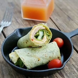 『饼皮,生菜叶,圣女果,鸡胸肉,煎蛋,土豆泥』