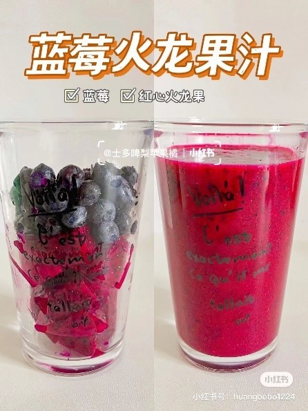 将准备好的蓝莓和红心火龙果放入榨汁机,加入适量水,开始榨汁