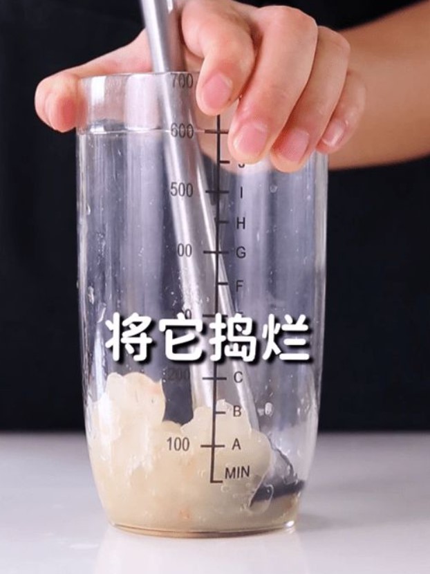在雪克杯中加入60克龙眼果肉,用柠檬锤将果肉捣烂后倒入出品杯中