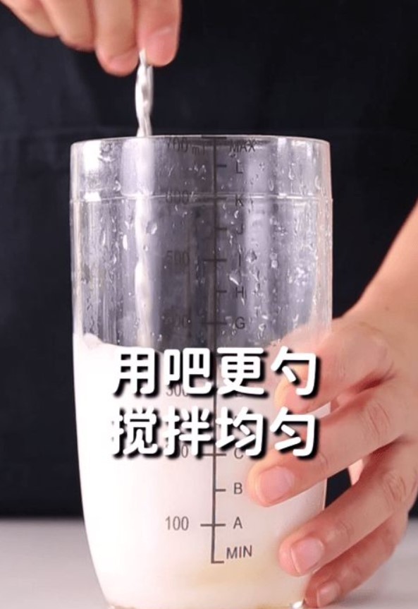 接着在雪克杯中加入200毫升椰子水、50毫升椰浆、30毫升黄金果糖,用吧更勺搅拌均匀
