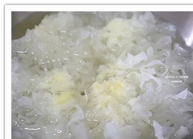 把银耳放入凉水中浸泡两小时,使银耳充分泡发。把银耳的根部去掉,撕成小块。