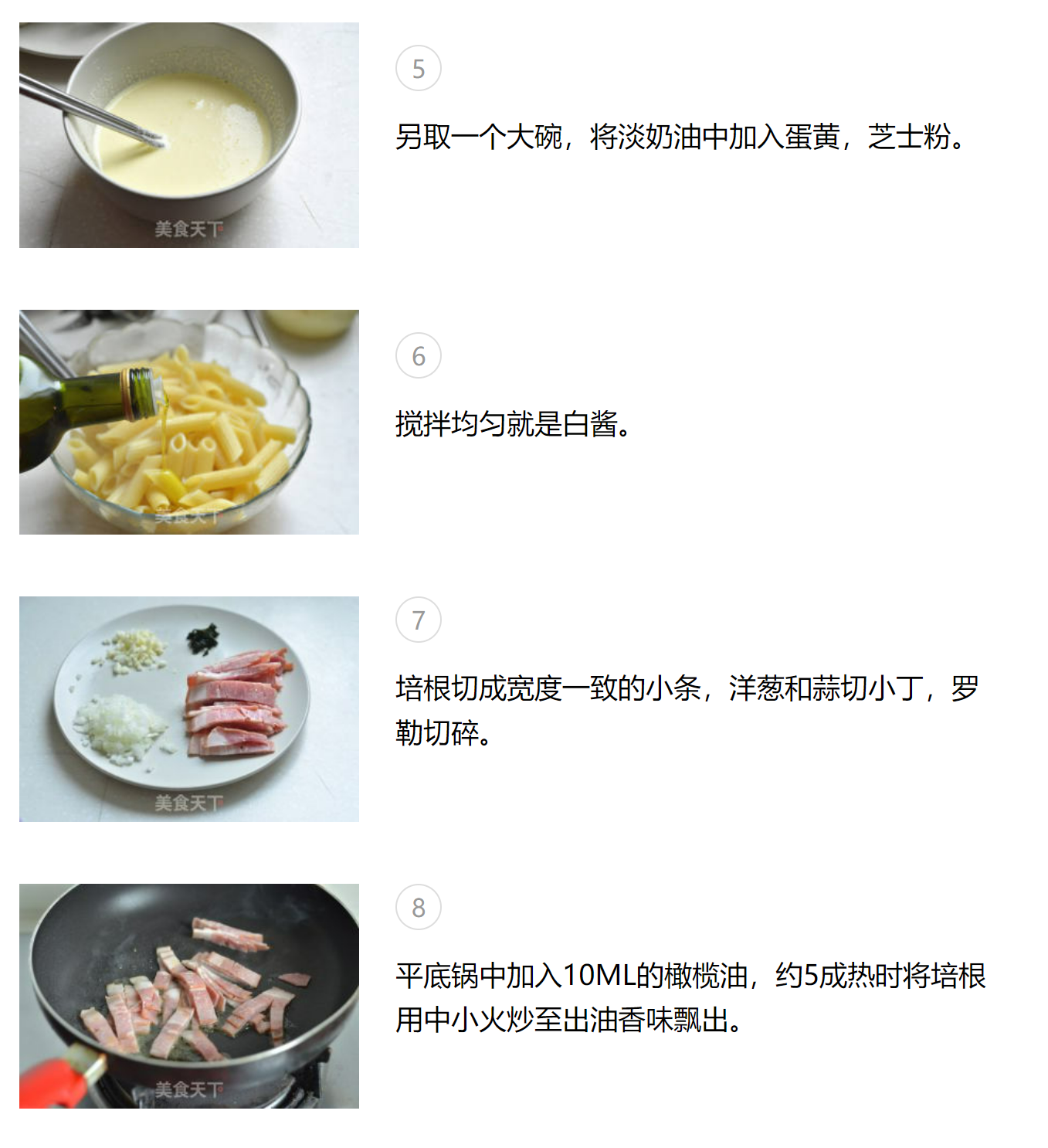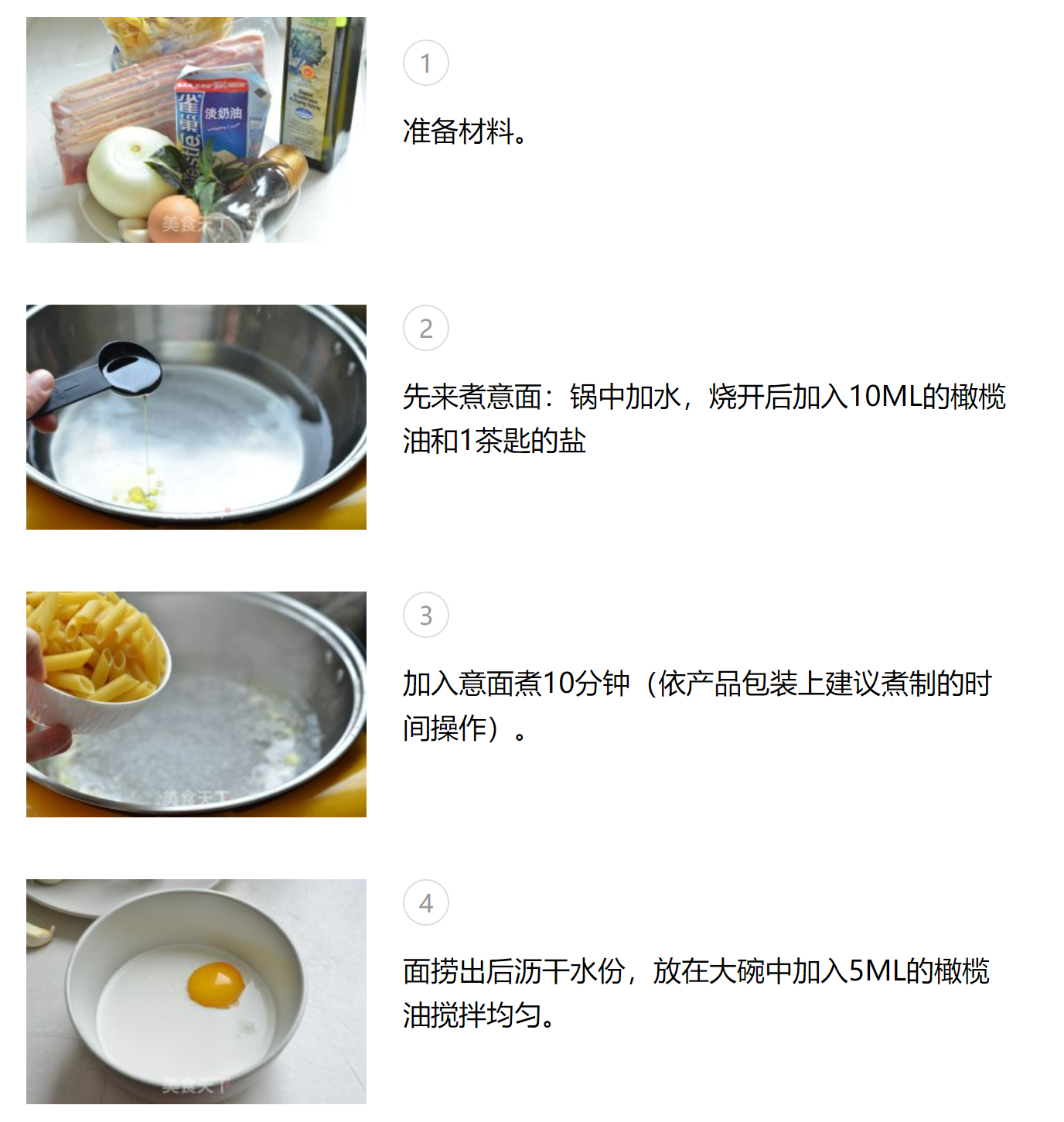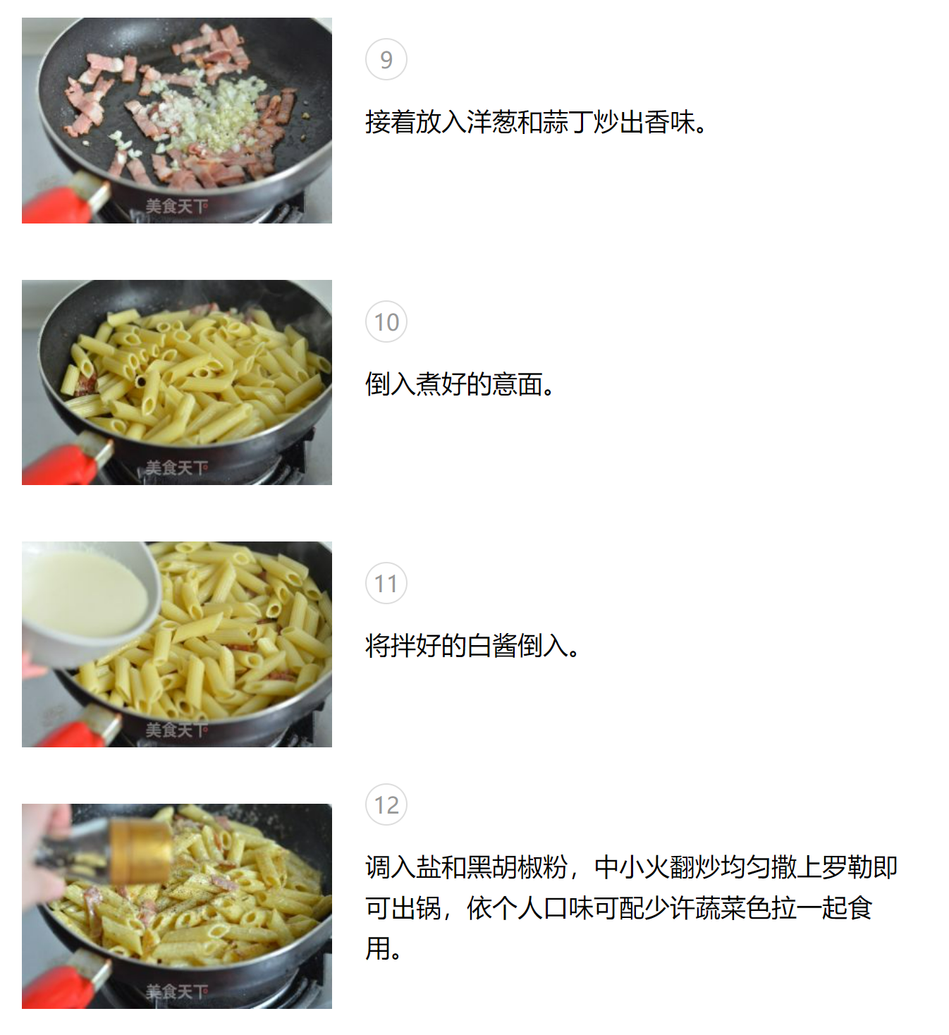 1.意大利面的种类很多,有直面,贝壳面,螺旋面,蝴蝶面等等,选自已喜欢的就好。 2.意大利面的包装上都会注明煮制的时间,依上面的操作就可以了 3.煮面的时候要不时的搅动,否则面也很容易粘连。 4.倒入白酱以后不要用大火,用中小火不停地翻炒,火大会很容易糊锅。