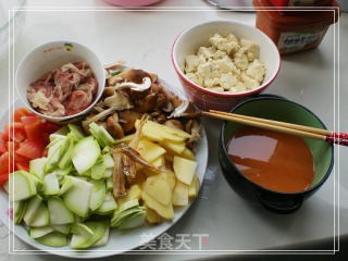 黄豆酱和辣酱加半碗淘米水和匀,番茄、豆腐切块,土豆切片,牛肉在开水中涮一下