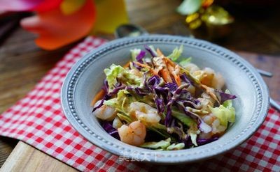 将时蔬入碗,将焯好的虾仁控水入碗,将沙拉酱均匀的挤在时蔬虾仁表面即可。