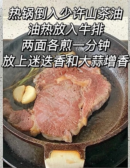 热锅倒入少许油,放入牛排,两面各煎一分钟,焯熟西兰苔