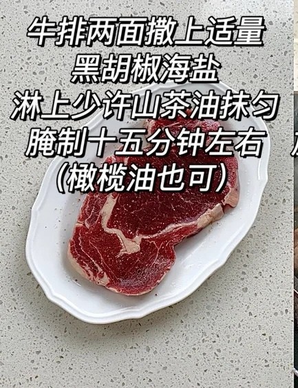 牛排两面撒上适量的黑胡椒海盐,淋上食用油,腌制十五分钟左右