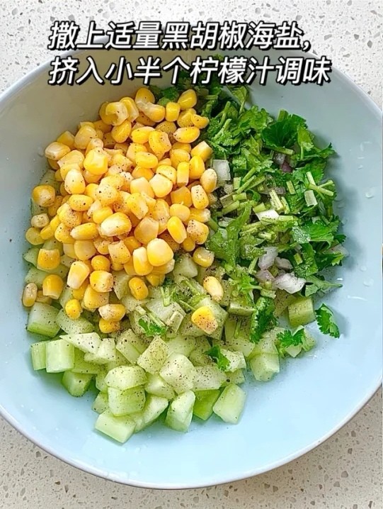 碗中放入黄瓜、玉米粒、洋葱、洋葱、香菜,撒上适量海盐,挤入柠檬汁调味