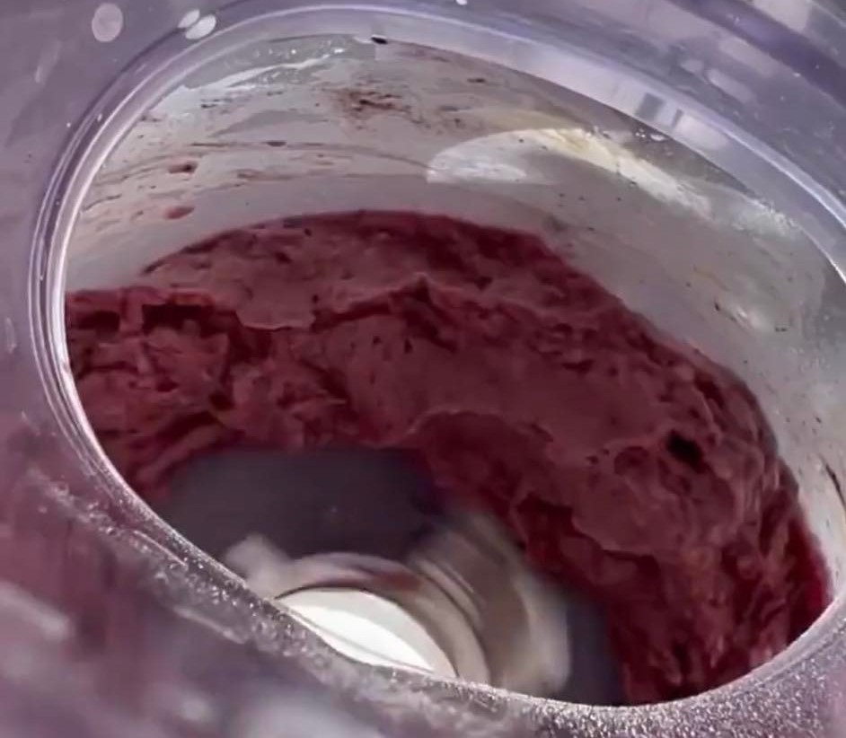 将冷冻水果放入料理机中,再加80毫升椰奶,搅拌至弄浓稠状