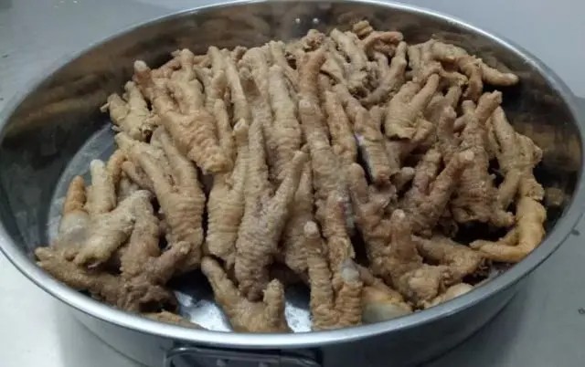 1、大凤爪5斤解冻冲净,投入沸水中,加醋精150克(可用白醋代替,具有祛除杂味的作用)、麦芽糖100克(上色)搅匀,大火煮至三成熟,捞出晾干表面水分,此时由于沾染麦芽糖,凤爪表面微微发粘。