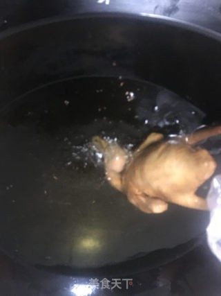 待油温发出吱吱响后(100度以上)把鸽子先全方位炸几分钟后,捞起,待两三分钟后,又炸(这样的步骤反复两三次)。
