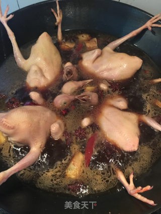 水开后,放入鸽子,大火卤8-10分钟,然后转小火卤20分钟,关火,待浸泡半小时至一小时(待用)。