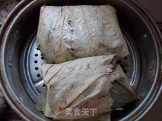荷叶用水洗净,将糯米饭包入,冷水上锅蒸30分钟