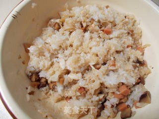 像平时煮饭一样将糯米煮熟,然后将煮好的糯米饭和步骤1、步骤2混合