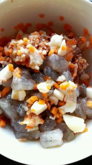腌制好的虾、碎肉、马蹄、碎胡萝卜搅拌均匀。