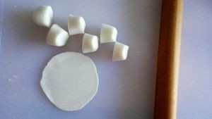 小麦淀粉和玉米生粉混合在一起。煮一小壶开水,慢慢倒入并不断搅拌,直到凝成团,再和匀。把和好的粉团搓成一长条,切成小块,用擀面杖擀成圆片。(暂时不用的小粉块要放在盆里盖起来,不要凉了)