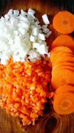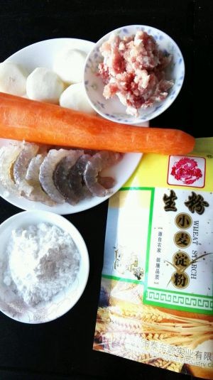 鲜虾切成约一厘米的小段,加入料酒、2克盐腌制。碎肉加一小匙酱油、沙茶酱和2g生粉腌制十分钟。马蹄切成约五毫米的方丁,胡萝卜大头的一边切二十片圆片,剩余的切小碎粒。