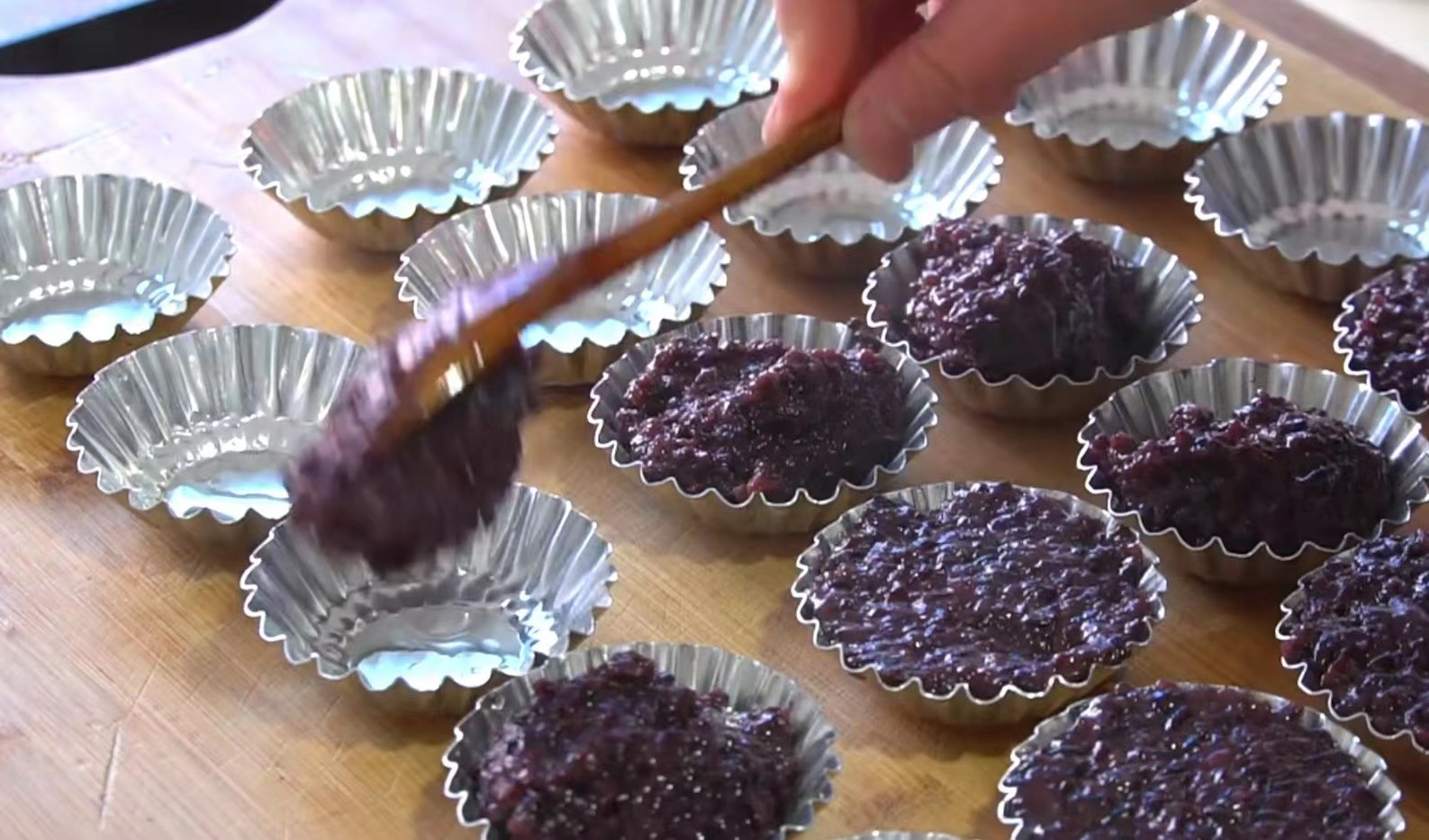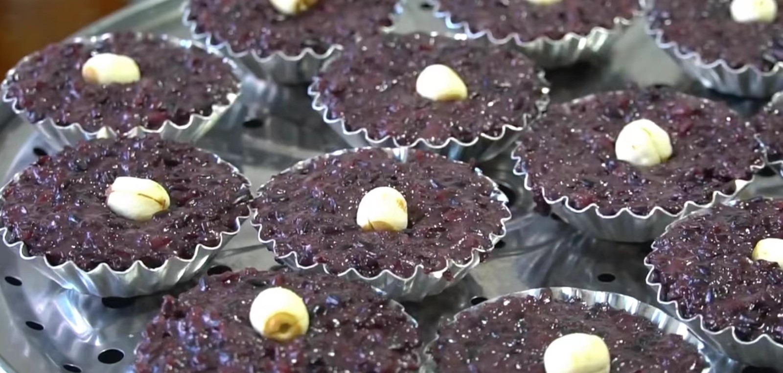 把拌好的黑糯米舀入模具里,表面抹匀,再放上一颗莲子