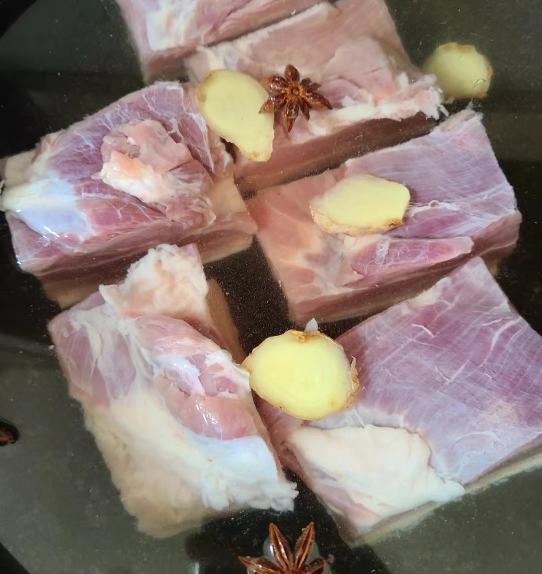 锅内加水,放入几片姜,少许八角,10克料酒,放入五花肉,大火煮,煮至肉色发白,无血色后捞出。