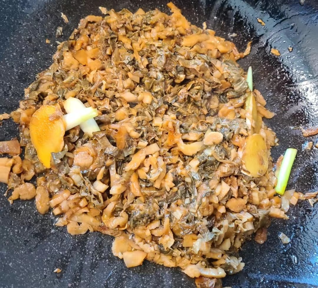 把梅菜干放入有余油的锅中,倒入少许煮肉的汁,加入少许耗油、盐、冰糖,小火焖煮15分钟。