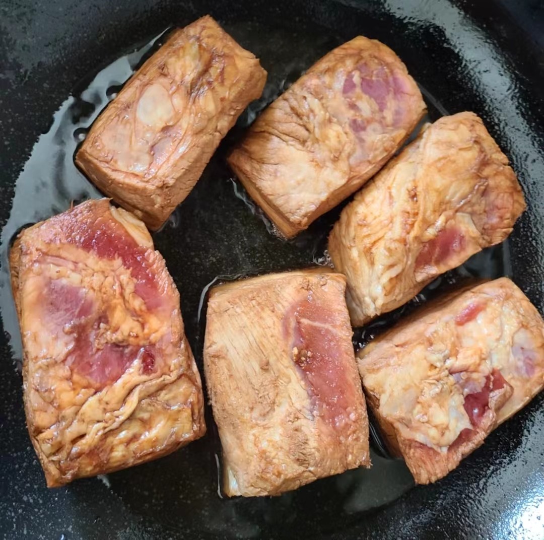将五花肉用凉水冲洗干净,在五花肉表面抹少许生抽。锅内抹一层油,待油烧至7成热,将肉皮向下,小火慢煎,直至肉皮颜色金黄,油脂溢出,将肉块四面都煎一下。