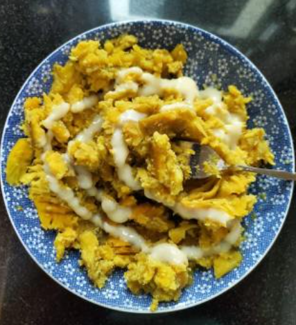 倒入碟子趁热用叉子压碎,加入炼乳,拌匀,把番薯泥放入小烤盘舖平,把芝士碎均匀摆放在上面。